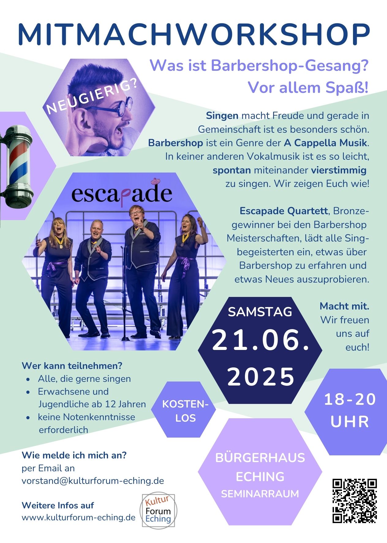 Am Samstag, den 21. Juni, veranstaltet das Kulturforum Eching einen kostenlosen Barbershop-Mitmachworkshop mit Escapade. Von 18 bis 20 Uhr stellt das erfolgreiche Quartett das A cappella Genre „Barbershop“ vor und ruft alle Singbegeisterten dazu auf, mit ihnen zusammen Barbershop zu singen. Man muss keine Notenkenntnisse mitbringen. Informationen zur Anmeldung: www.kulturforum-eching.de/aktuelles