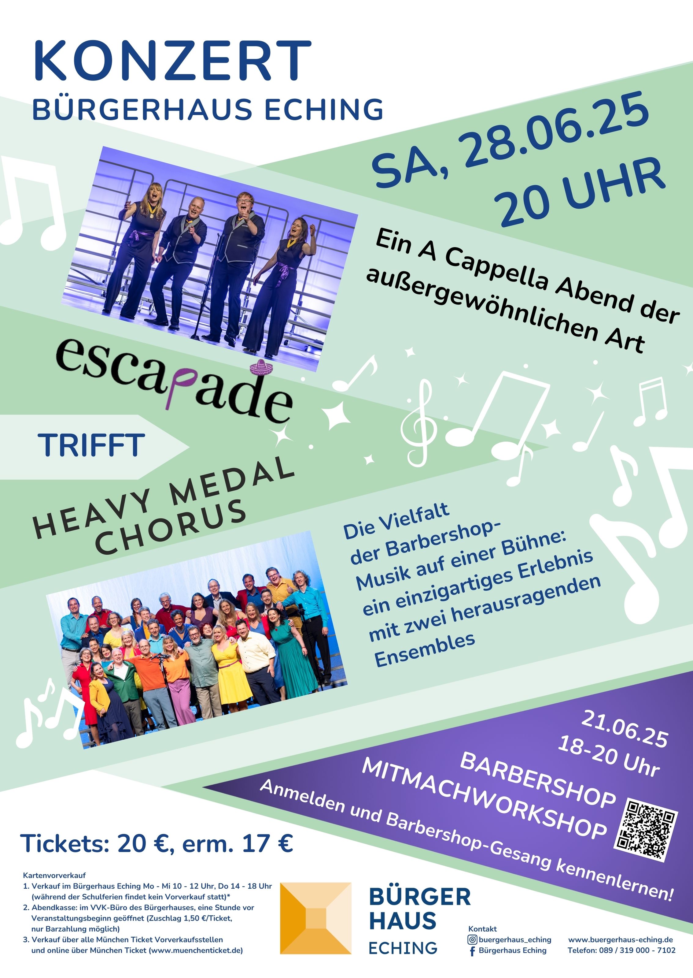 Wer lieber Musik hört anstatt selbst zu singen, darf sich auf das Konzert von Escapade am Samstag, den 28. Juni im Bürgerhaus freuen. Hier treten nicht nur die vier stimmgewaltigen Quartett-SängerInnen auf, sondern sie haben gleich noch ihren gemischen Barbershop-Chor Heavy Medal Chorus mitgebracht, in dem sie alle zusammen auch singen. Tickets gibt es hier: