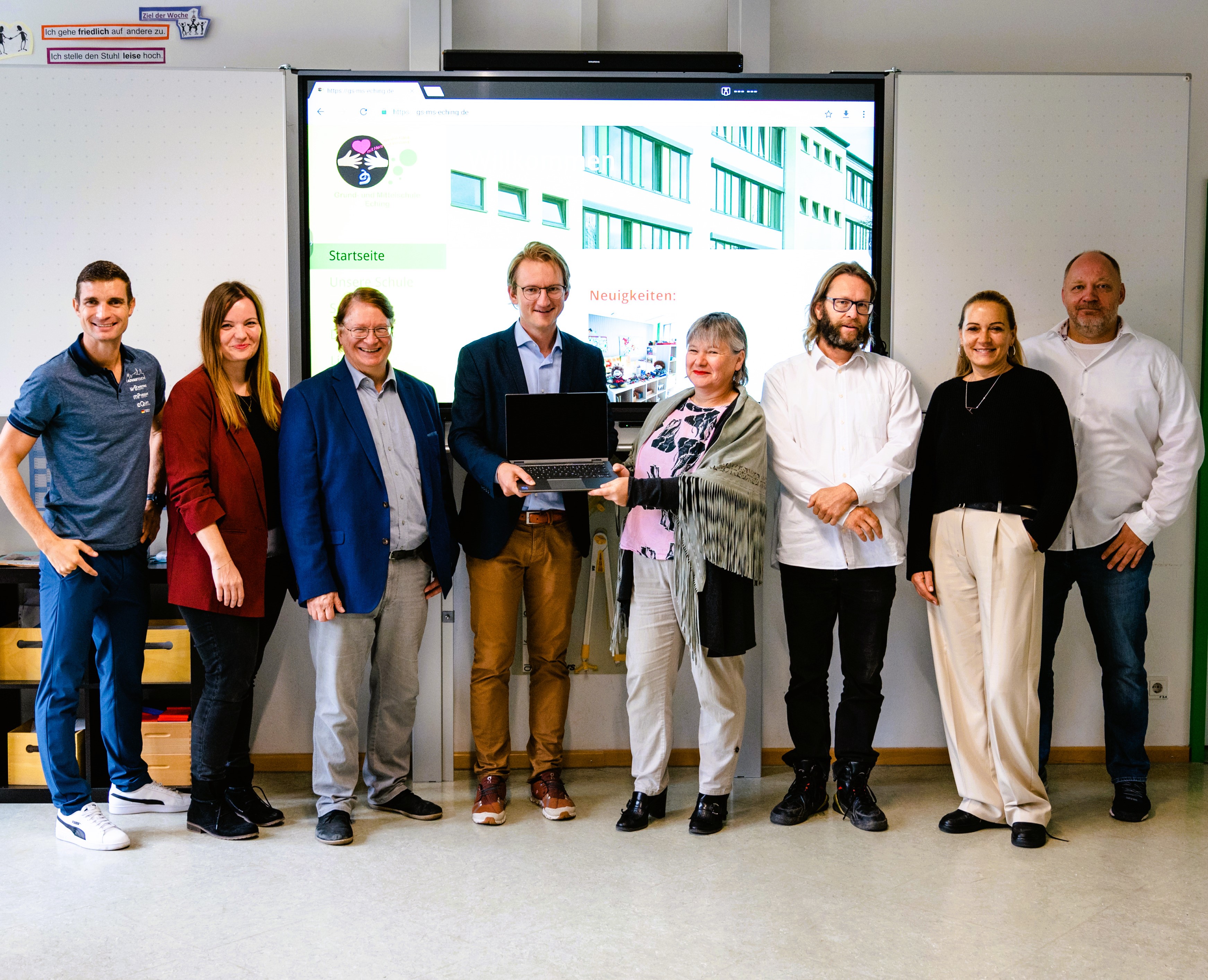 Manuel Karger (Firma Degen GmbH), Beate Hammer (Konrektorin), Axel Reiß (2. Bürgermeister), Sebastian Thaler (1. Bürgermeister), Barbara Müller (Schulleiterin), Ansgar Ehrensperger (Lehrer/Medienteam), Andrea Wagner (Rathaus, Schulverwaltung), Michael Molle (Rathaus, IT)