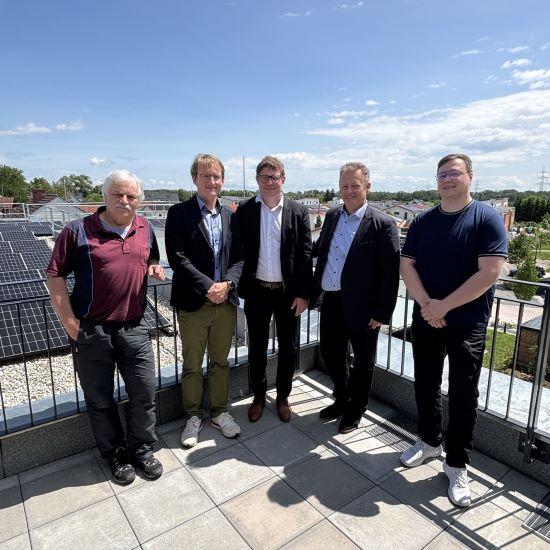 Foto links: Herbert Hahner, Gemeinderat / Thomas Bimesmeier, Bauamtsleiter / Michael Rössler, kaufm. Geschäftsführer / Sebastian Thaler, Bürgermeister Gemeinde Eching / Franziska und Johannes Mayr, Geschäftsführung Baugeschäft Mayr