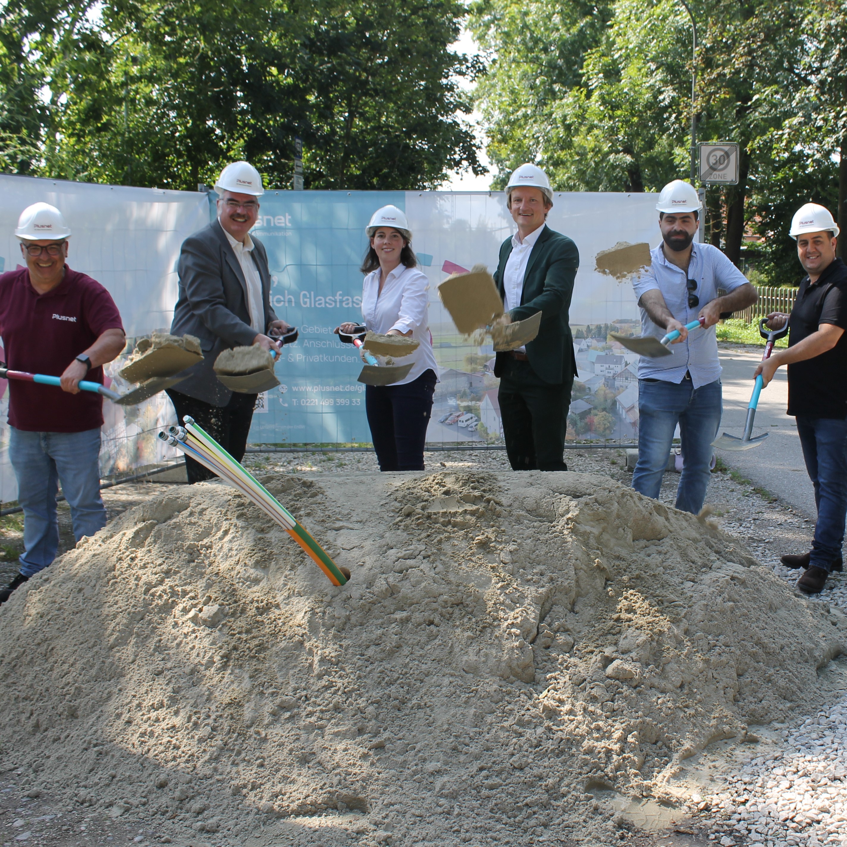 Beim Spatenstich am Echinger Bahnweg: v.l. Uwe Plonka (Leiter Glasfaservertrieb Plusnet), Sven Nitsche (Gebietsmanager Plusnet), Ines Mannseicher (Wirtschaftsförderung Gemeinde Eching), Sebastian Thaler (Erster Bürgermeister), Chebli Al Arian (Projektleitung GP-Projekte Plusnet) sowie Ignazio Taranto (Geschäftskundenvertrieb Glasfaser Plusnet)