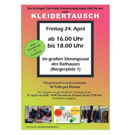Am Freitag, den 24. April 2026 findet ab 16.00 Uhr bis 18.00 Uhr ein Kleidertausch im großen Sitzungssaal im Rathaus statt. Dieser wird erneut organisiert von der Fairtrade Steuerungsgruppe des Klimabeirates der Gemeinde Eching.