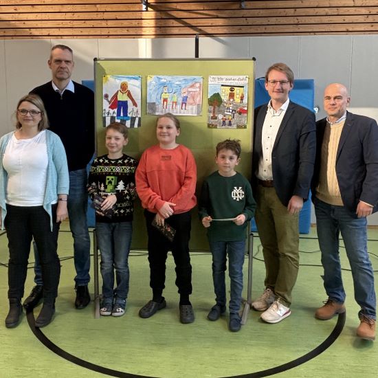 (auf dem Foto v.l.: Sina Ruppe (Elternbeirat), Andreas Polzin (Vorsitzender Elternbeirat), Kilian Kassner (3. Platz), Iulius Artius (2. Platz), Jonathan Bukvasevic (1. Platz), Bürgermeister Sebastian Thaler, Frank Horlbeck (stellv. Vorsitzender Elternbeirat))