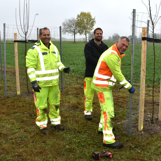Bereits 50 Bäume haben die Bauhofmitarbeiter in der neuen Obstgartenanlage gepflanzt, ein weiterer Baum wurde im Beisein der Kinder eingesetzt. Herr Thomas Dolzer erklärte kindgerecht worauf es ankommt, wenn ein Baum gepflanzt wird und seine Bauhofkollegen setzten jeden einzelnen Schritt anschaulich und verständlich für die Kinder um.