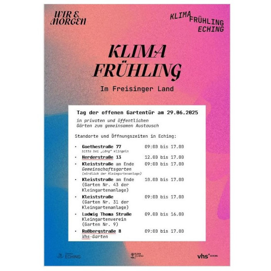 Die Gemeinde Eching rief im April 2025 alle Gartenliebhaberinnen und Gartenliebhaber im Gemeindegebiet auf, ihre Gärten zu zeigen bzw. die Gärten ihrer Nachbarn zu besuchen.