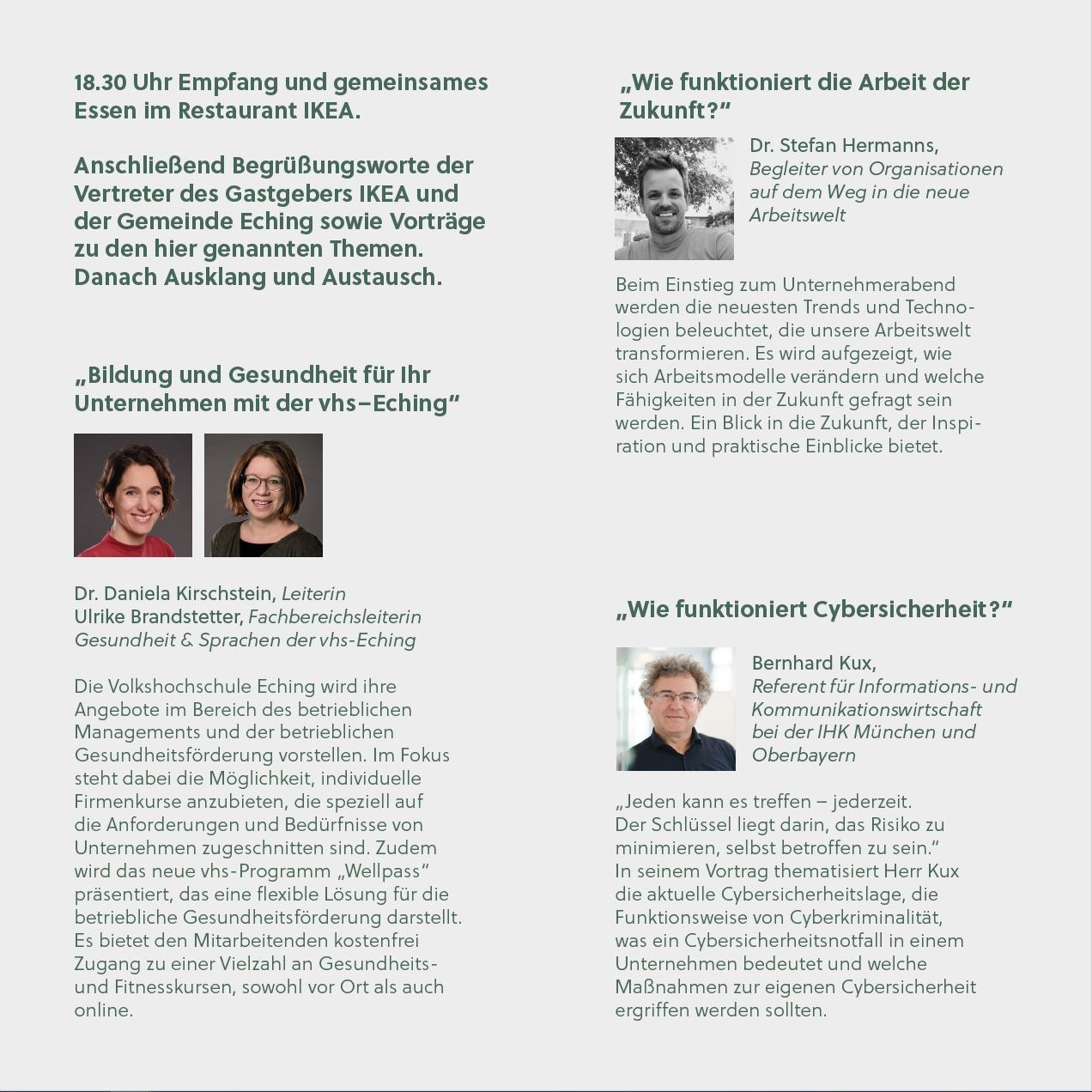 Der Abend beginnt mit einem Empfang und Begrüßungsworten von Vertretern der Gemeinde Eching und IKEA. Anschließend widmen wir uns dem Austausch über aktuelle Themen, die für Unternehmen von Bedeutung sind. Dr. Stefan Hermanns erläutert wie die Arbeit der Zukunft funktioniert. Bernhard Kux klärt auf wie Cybersicherheit gelingt. Dr. Daniela Kirschstein und Ulrike Brandstetter präsentieren vielfältigen Bildungsangebote der Volkshochschule Eching, die speziell auf die Bedürfnisse von Unternehmen zugeschnitten sind.