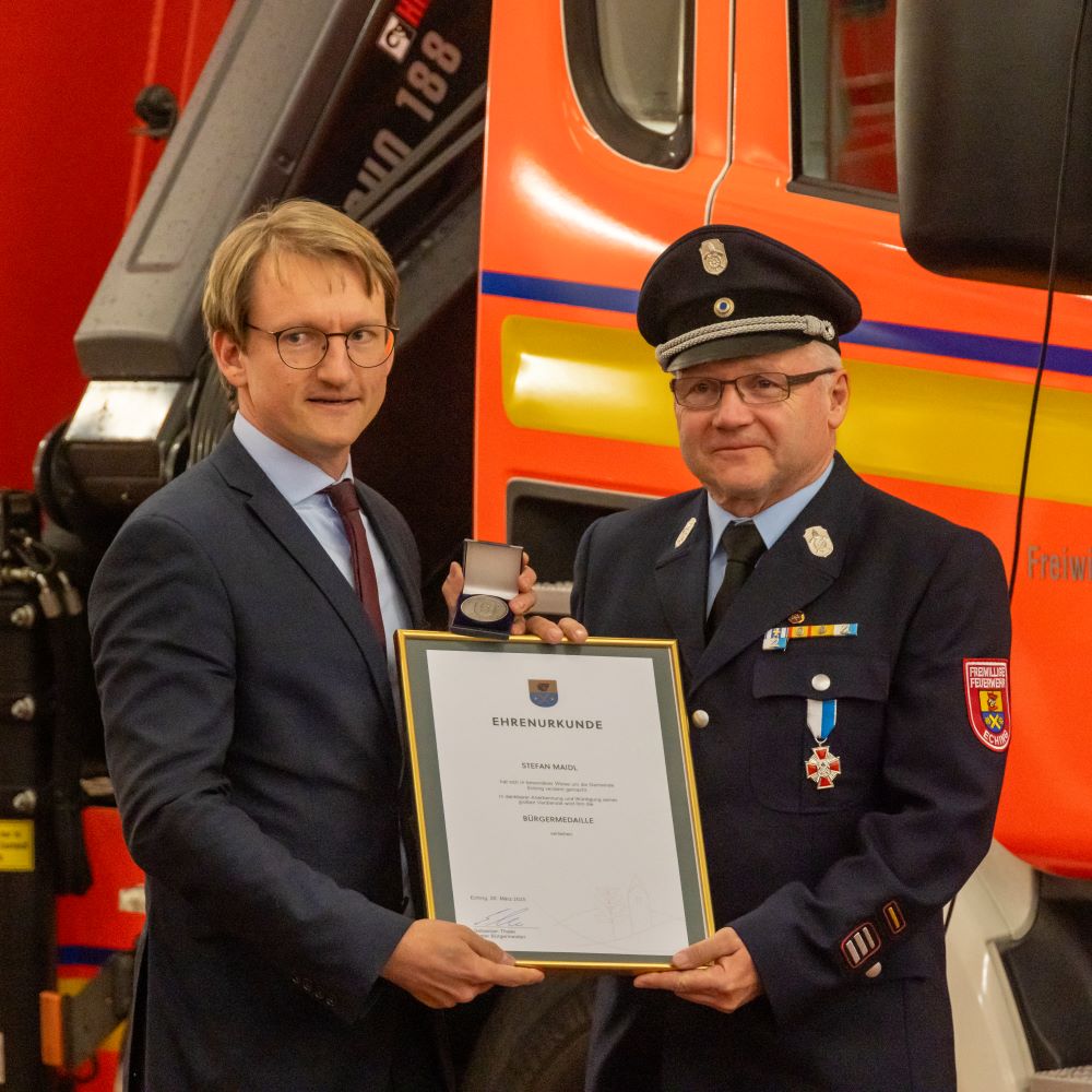 Sebastian Thaler würdigte seine Verdienste mit den Worten: „Stefan Maidl hat über Jahrzehnte hinweg mit Herzblut und Sachverstand die Feuerwehr Eching geführt und geprägt. Er übergibt ein bestens aufgestelltes Team und eine Organisation, auf die unsere Gemeinde stolz sein kann. Mit größter Anerkennung und herzlichem Dank verleihe ich Stefan Maidl die Bürgermedaille im Namen der Gemeinde Eching als Ausdruck unserer höchsten Wertschätzung.“