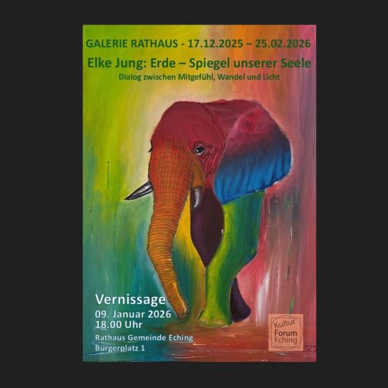 Einladung des Kulturforum Eching zur Vernissage von Elke Jung am 09. Januar um 18:00 Uhr im Foyer des Echinger Rathauses: Erde - Spiegel unserer Seele; Dialog zwischen Mitgefühl, Wandel und Licht.