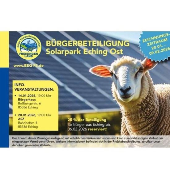 Am Mittwoch, 28. Januar 2026 findet am 19 Uhr ASZ Mehrgenerationenhaus, Bahnhofstraße 4, 85386 Eching, die zweite Info-Veranstaltung der Bürger Energie Genossenschaft Freisinger Land eG statt. Die erste Informationsveranstaltung am 14. Januar fand großes Interesse und war mit rund 80 Personen gut besucht!